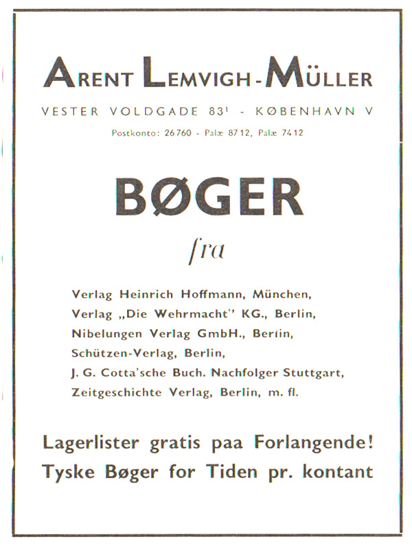 | Historie | 1942 starter Arnt Lemvigh-Mûller forlagsvirksomhed og en tilhørende boghandel med tysk litteratur. Han var redaktør af flere nazistiske tidsskrifter. Efter krigen holdt han lav profil.